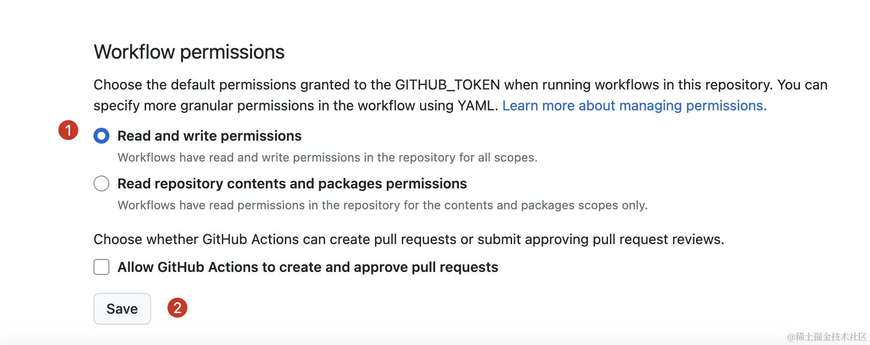 如果出现如上情况,说明 action 的 workflow 的权限不足,可以到项目中 settings->actions->general 中调整下 Workflow permissions 权限就可以了