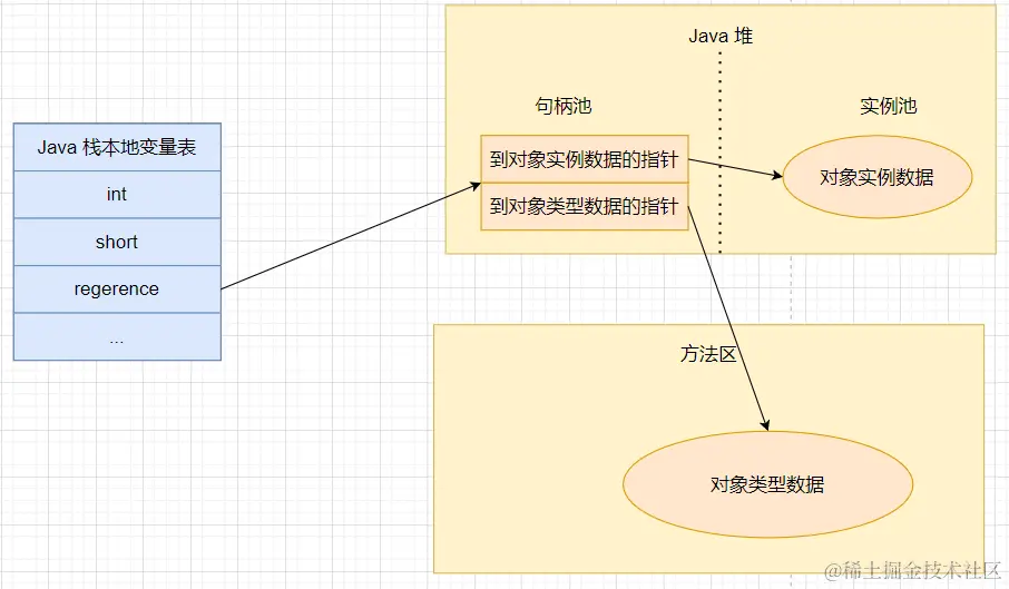 Java 程序会通过栈上的 reference 数据来操作堆上的具体对象,主流的访问方式主要两种:句柄和直接指针。