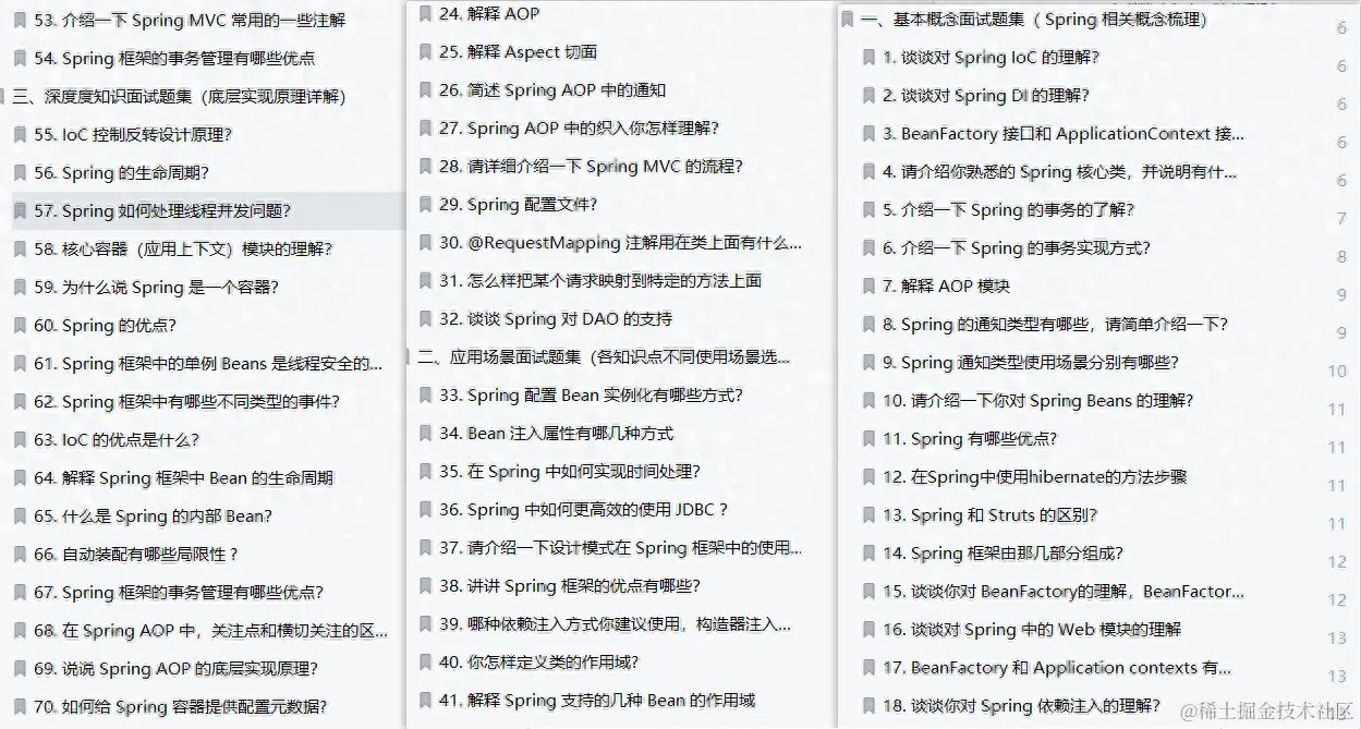 先看一份今年最新的Spring的面试真题整理,大家看一下目录,内容有点多这里放不下。
