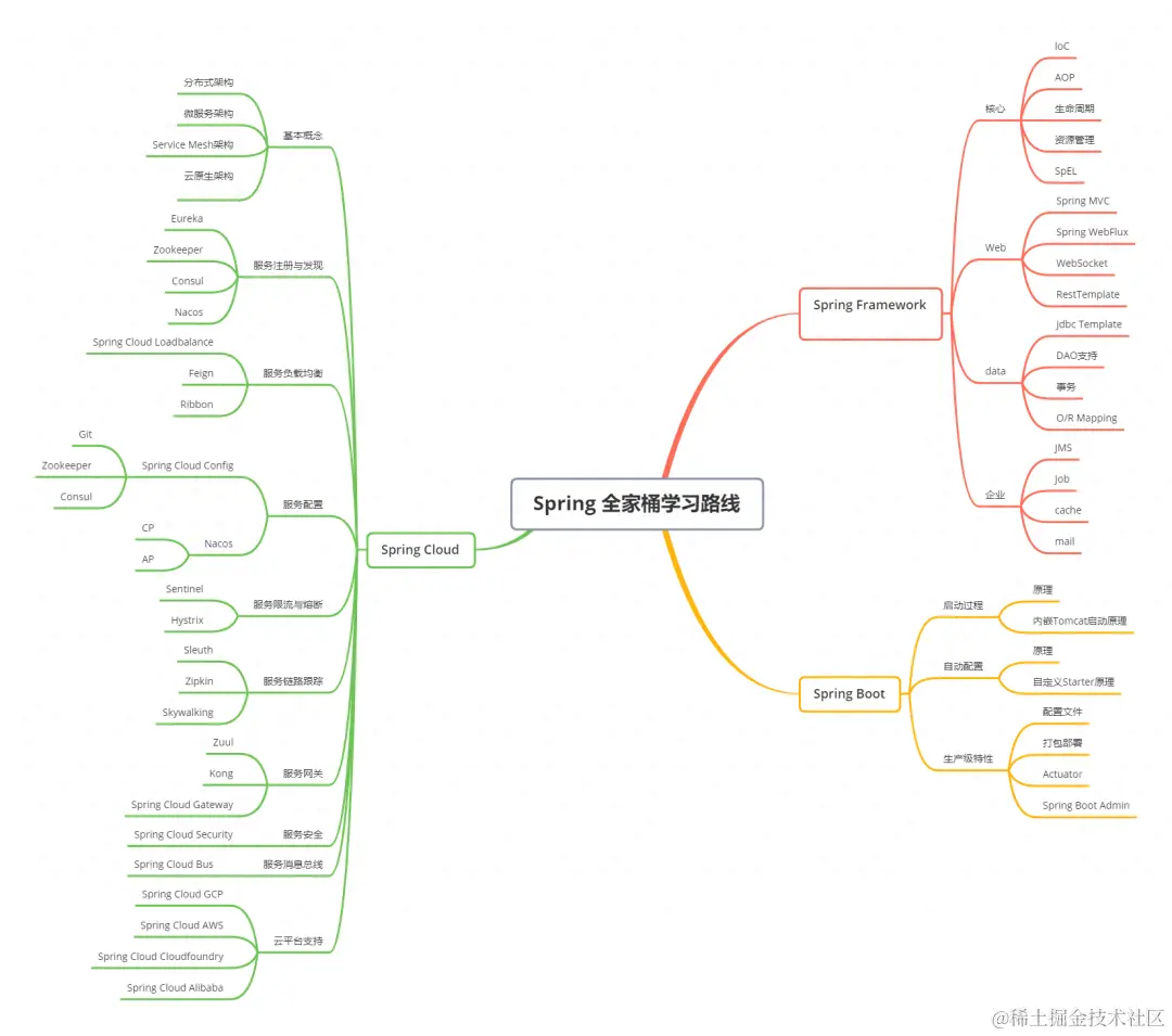 接下来就是Spring全家桶的思维脑图,其实就是让大家先预览一下Spring的知识点大纲,心里有个谱。