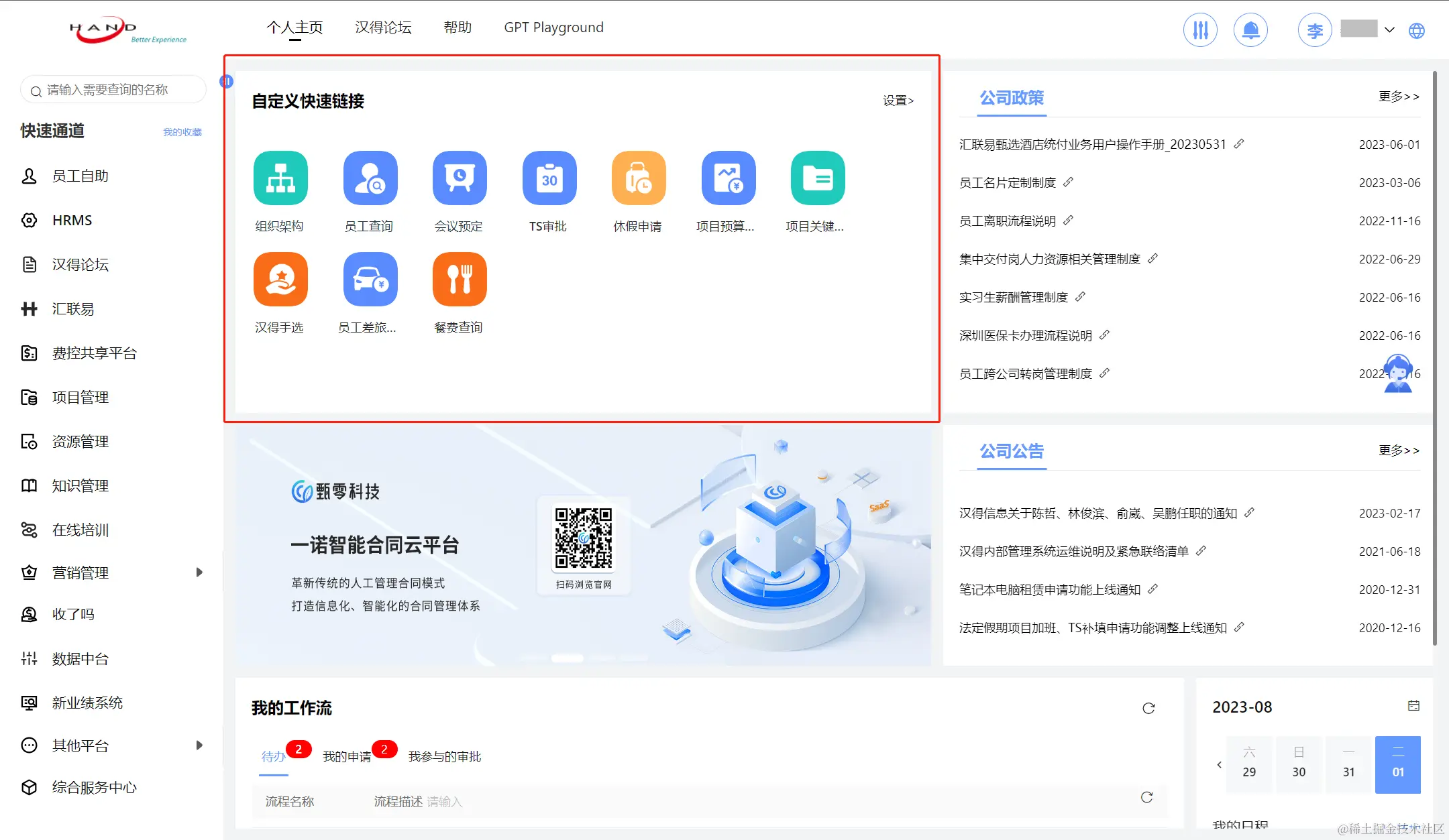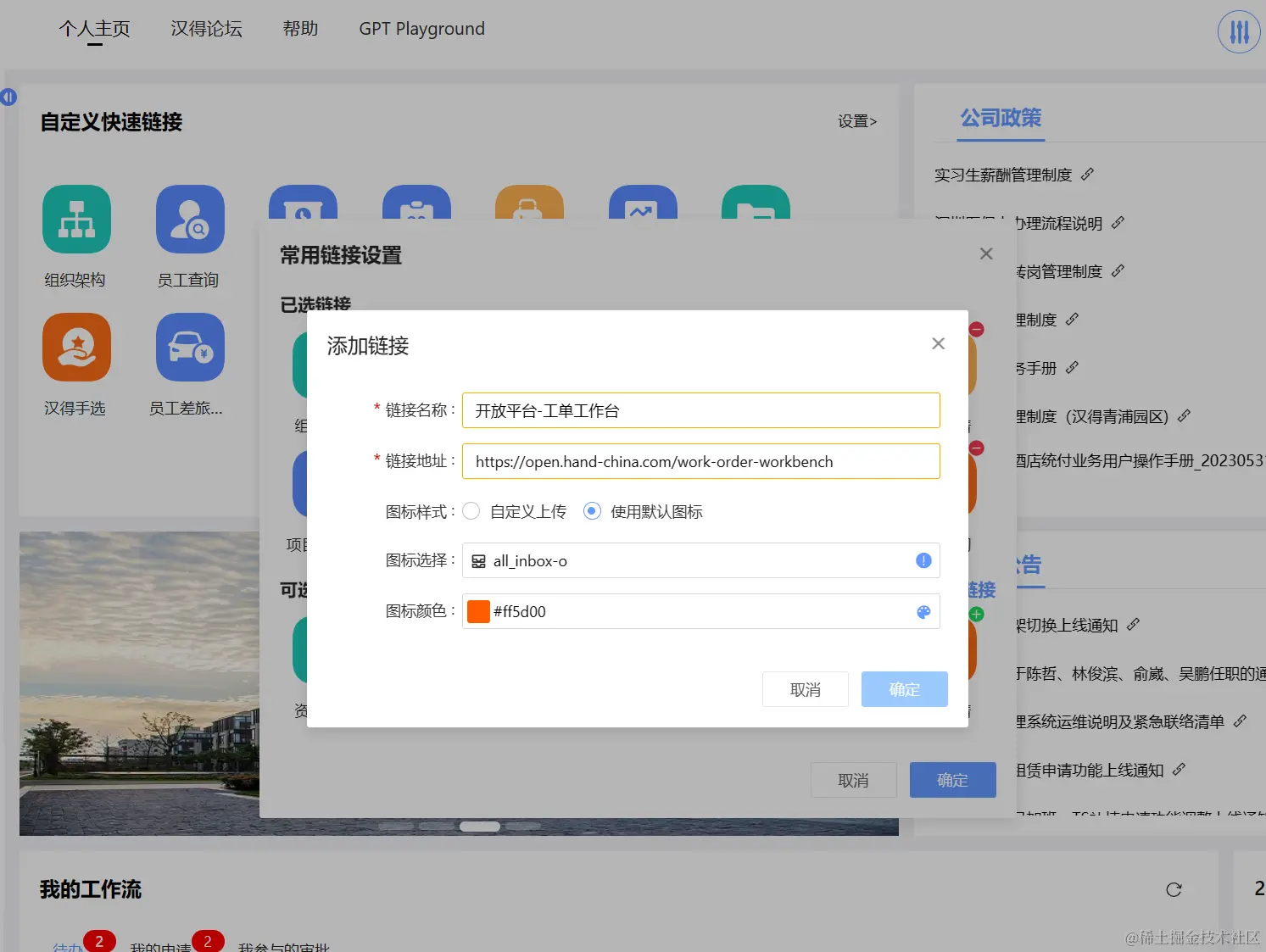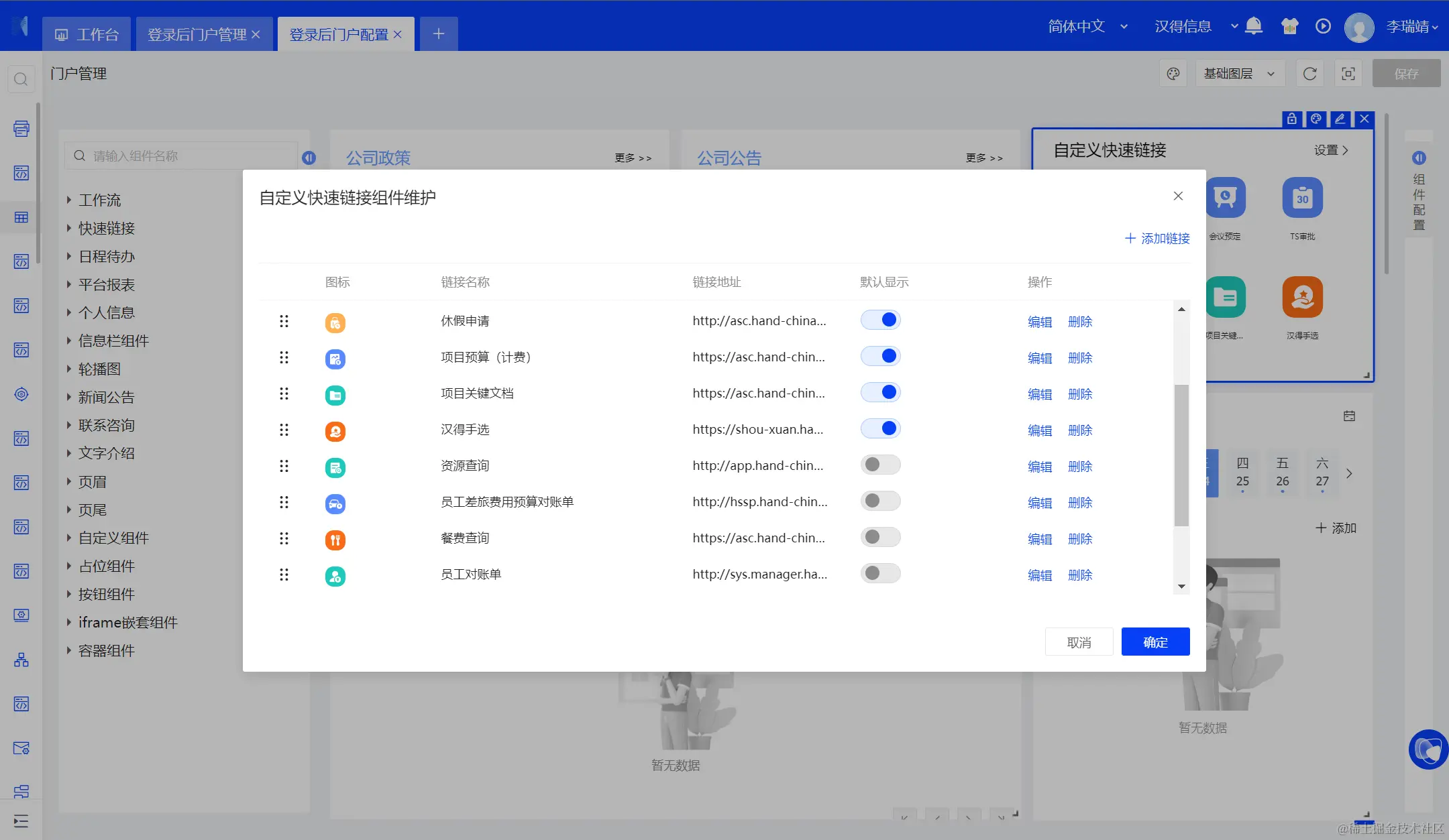 下面我们一起来看看汉得EIP门户中自定义快速链接组件的应用实例。