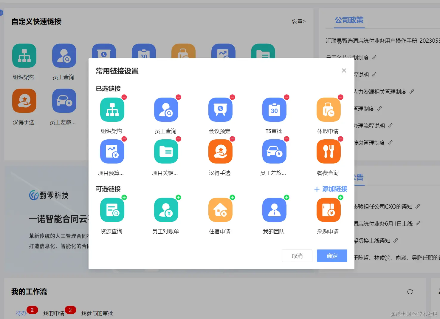 这个组件的“自定义”体现在哪里呢?首先,每位员工可以根据自身需求,将自己较为常用的子应用链接挂载在门户首屏,而一些不常用的链接,则可以隐藏起来。