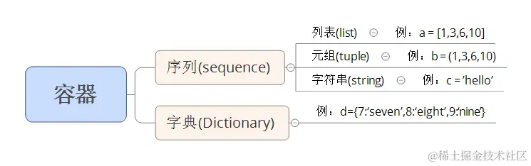 首先要从容器说起,Python中有一种名为容器的数据结构,顾名思义,容器,就是装数据的器具,它主要包括序列和词典,其中序列又主要包括列表、元组、字符串等,如下图: