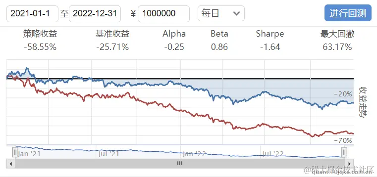 回测结果:红色曲线为策略收益率曲线,蓝色曲线为对应的基准指数收益率曲线