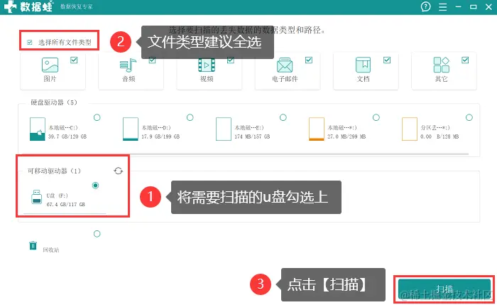 2.此时先在【可移动驱动器】下将对应的u盘勾选上,然后可以选择你想要恢复的文件类型(建议全选,也可根据实际需要进行选择),完成后,点击 【扫描】 ;