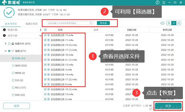 4.软件将会对你的u盘进行全面且深入的扫描,扫描完成后,建议进入 【筛选器】中对需要恢复的文件进行定位,确定勾选所有需要恢复的文件之后,单击【恢复】 。