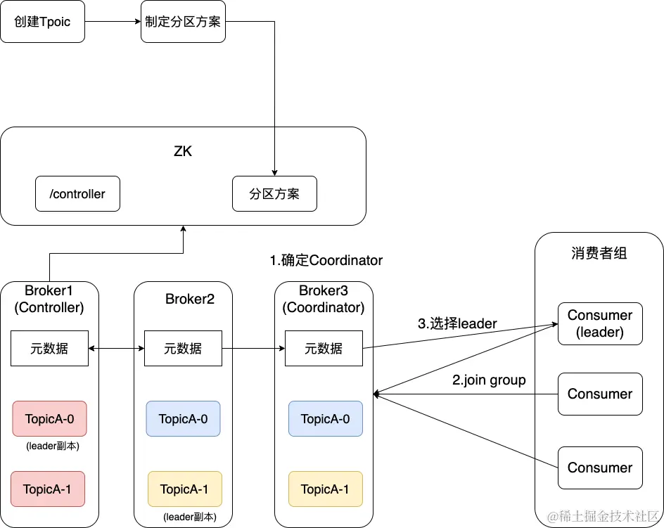 leader会根据要消费的Topic及分区情况制定一个消费方案,告知给Coordinator,Coordinator再将此消费方案告知给各个follower。