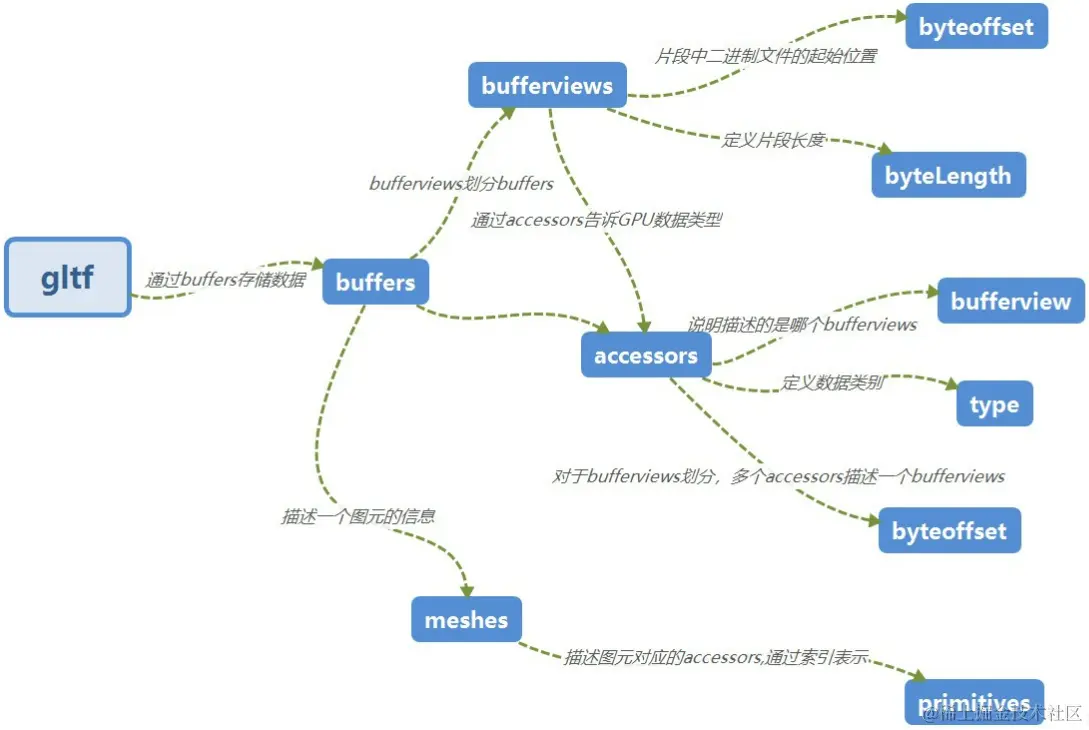 .gltf,文本文件,json格式,可以只有这个一个文件。.gltf+.bin,.bin文件通过glTF里的buffers.uri引用。.gltf+.bin+图片文件,图片文件通过glTF里的images.uri引用,图片文件可以放在同级目录,也可以放在子目录里,纹理图片通常放在textures目录里。