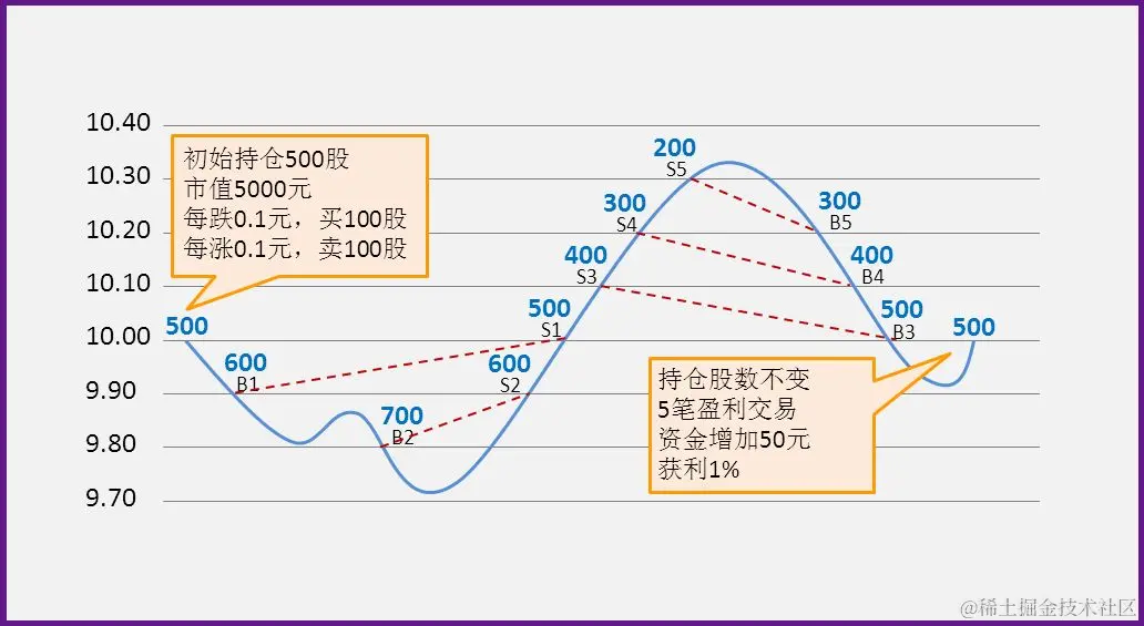 可以明确的是,上述网格交易中每笔交易都是盈利的。只要股价不断的上下波动,那么策略就可以不断的盈利。