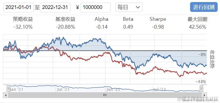 回测结果:红色曲线为策略收益率曲线,蓝色曲线为对应的基准指数收益率曲线