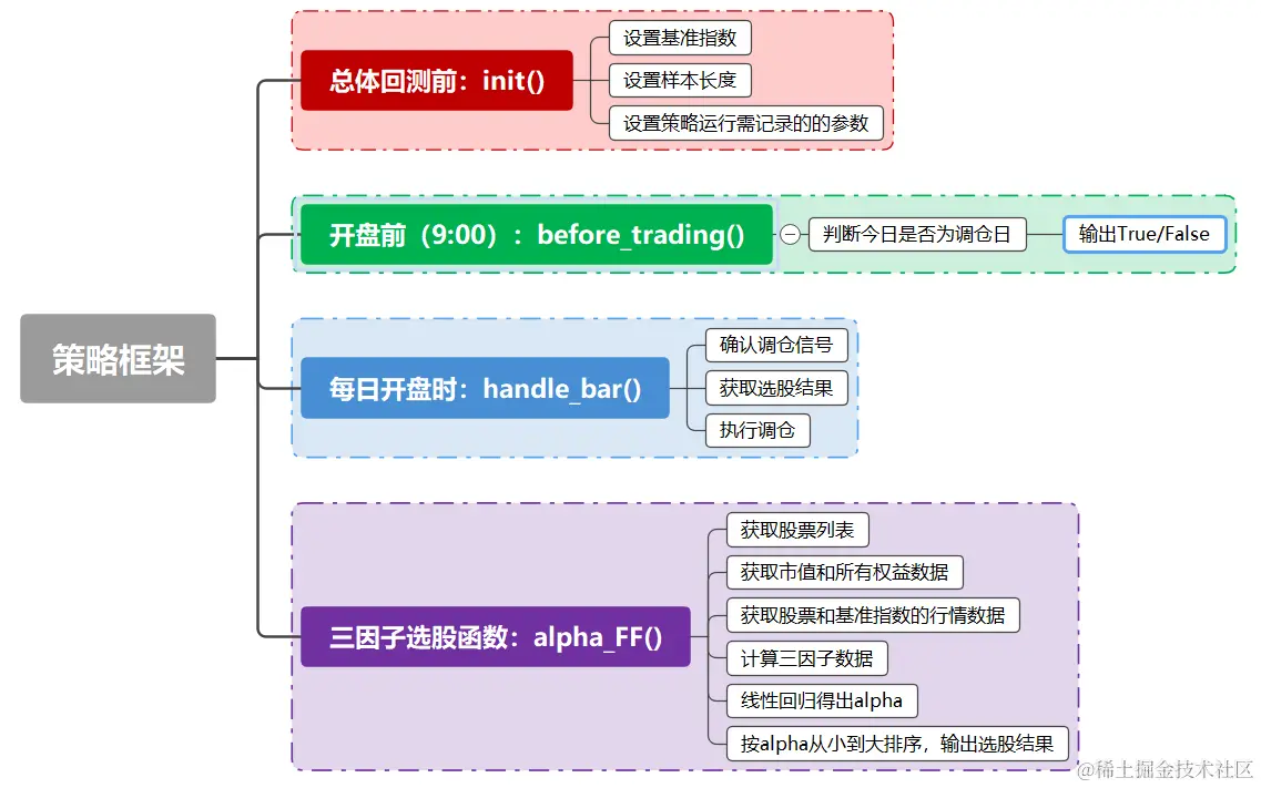 因子值的计算完毕后需整理成一个DataFrame格式,以便后续进行因子回归,该部分操作需要同学们熟悉DataFrame的常用操作,以下是作者实现三因子模型中,研究环境的代码草稿,分享给同学们。