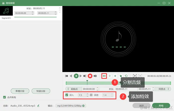 第3步:设置完成后开始进行录音,录音结束后,可以选择进入 “高级剪辑” 功能里,对音频进行分割、添加特效等操作,然后保存录制的音频文件。