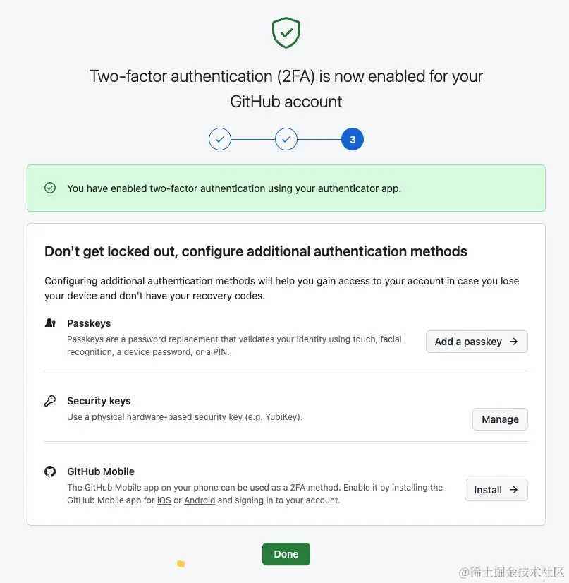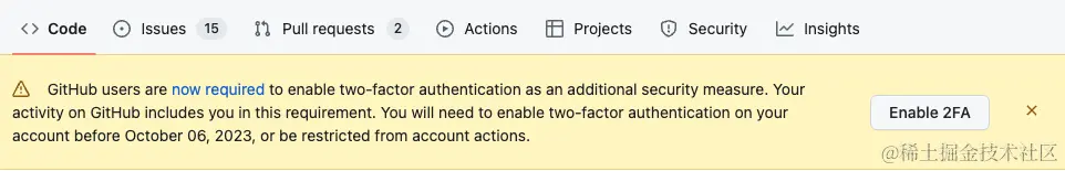 最近上GitHub一直都会弹出一个黄色框框,提示要开启2FA(two-factor authentication,即:双重身份验证)。