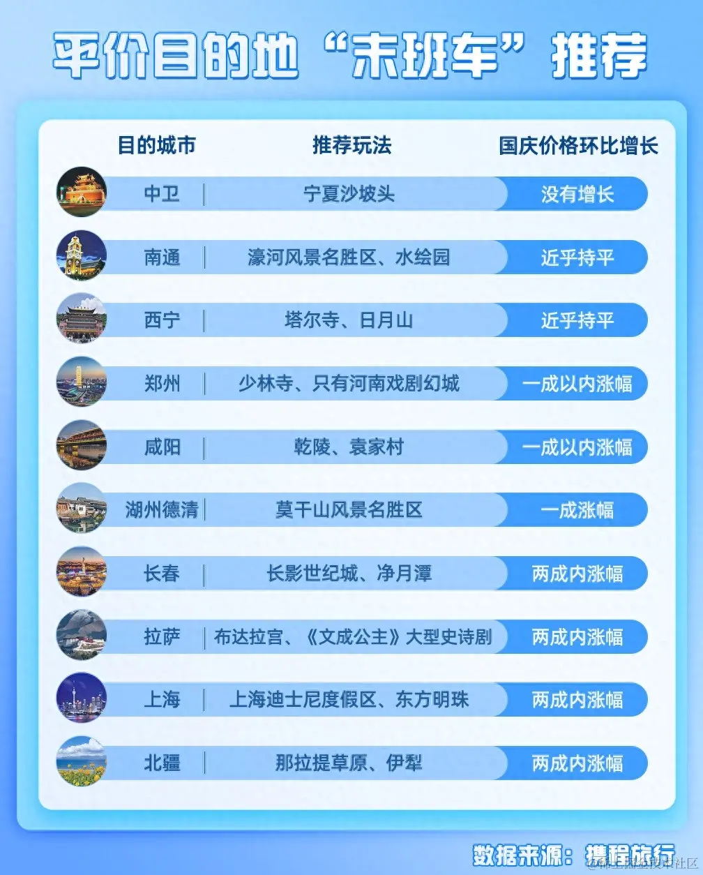 携程数据显示,截至9月22日,酒店间夜均价国庆价格与9月同期环比涨幅来看,宁夏中卫、江苏南通、青海西宁、河南郑州、陕西咸阳、湖州德清、吉林长春、西藏拉萨、上海及北疆的酒店均价涨幅在两成以内,中卫、南通和西宁相较9月同期近乎没有涨幅波动,堪称“双节”的“平价目的地”。