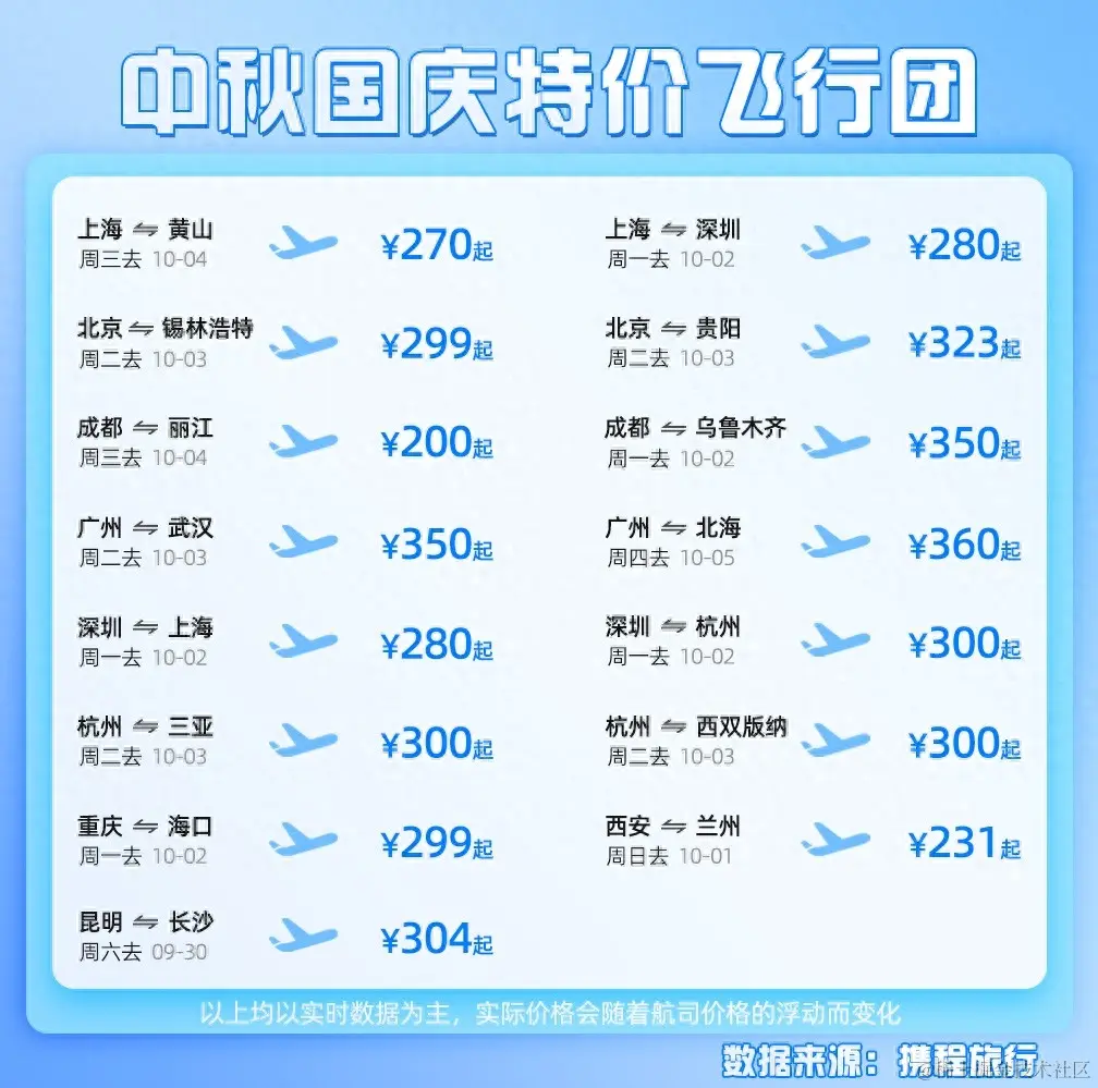 从境内机票均价来看,假日期间机票均价为1187元。若想避开价格“高峰”,游客可以避开9月28日、9月29日、10月5日、10月6日出行高峰。携程数据显示,10月2日、3日机票均价开始“退烧”,均价较高峰日期回落20%至30%,人少景美价格合理,节中的“错峰侠”可以先下手为强。