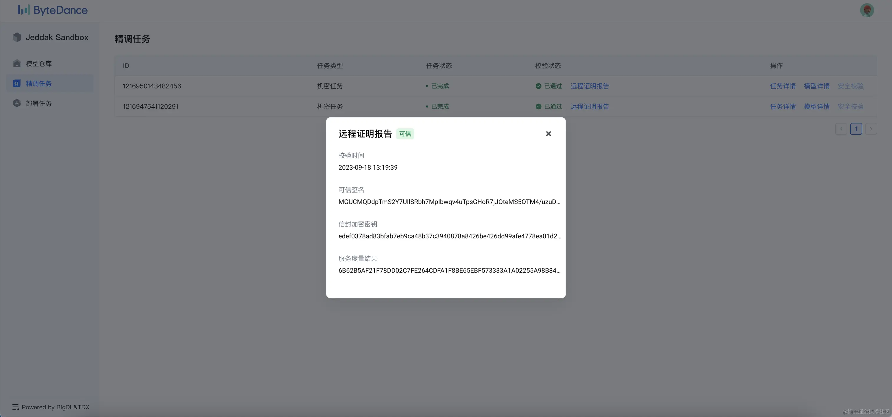 - 模型精调验证: 在精调服务运行过程中,支持动态校验的方式来判断服务是否可信。用户可以获取精调服务返回的远程证明报告,通过检测精调服务确实运行在TEE环境并且度量值与预期一致,来确保服务的安全。