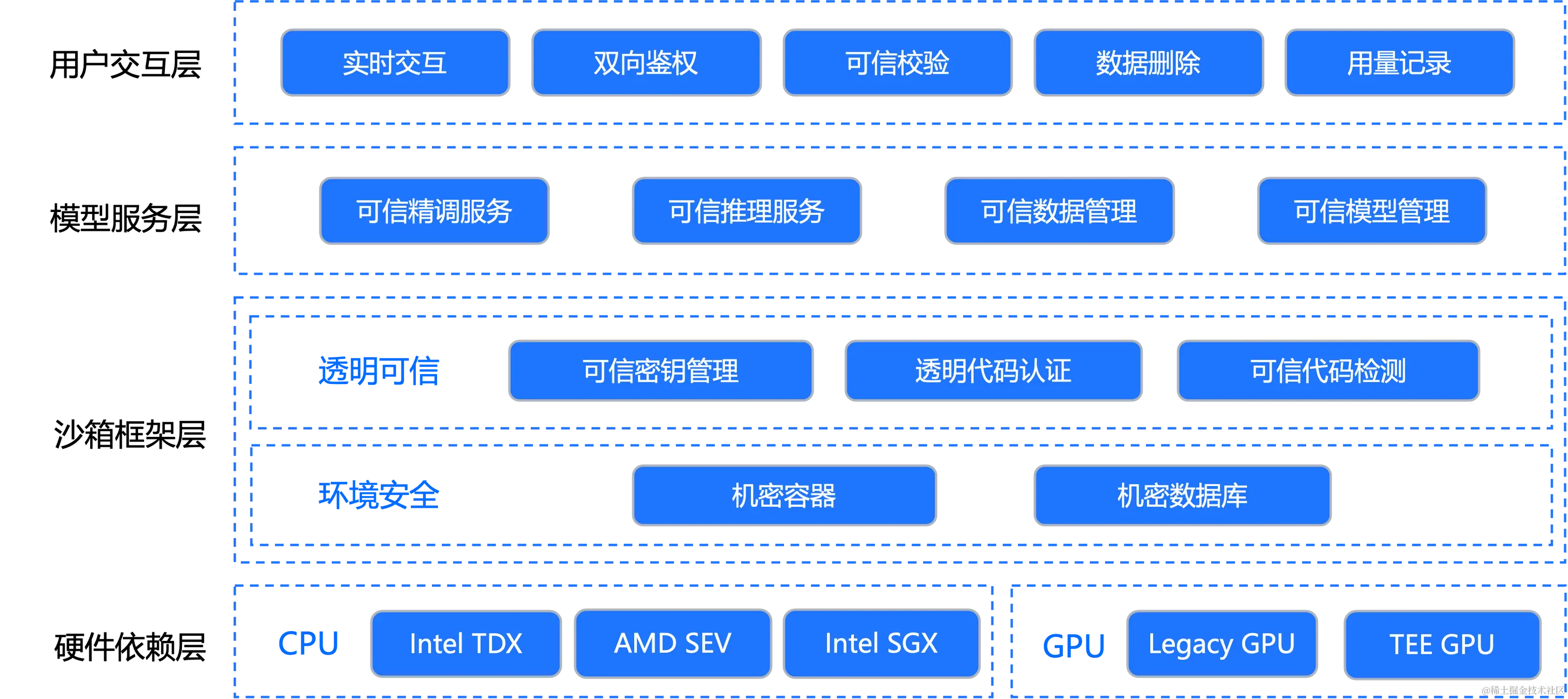 - 云供应商:平台方从安全和隐私角度出发,迫切需要建立与推理用户、模型提供商之间的互信机制。