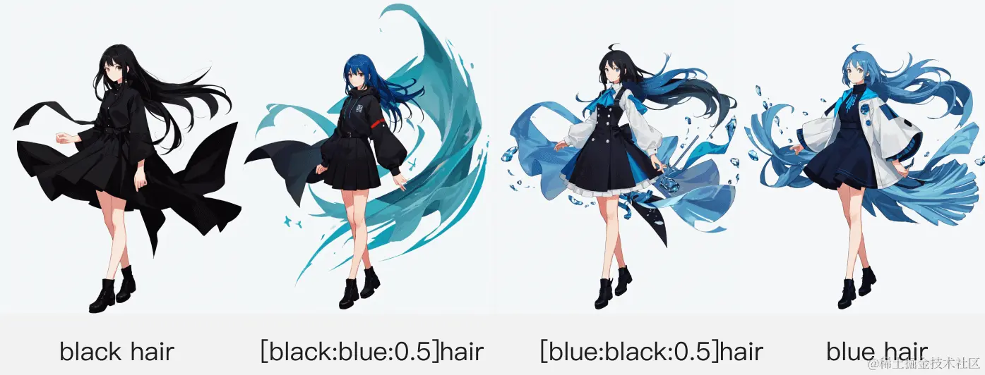 比如: [black:blue:0.5]hair,如采样步数为30,则表示在前15步使用black hair,之后使用blue hair