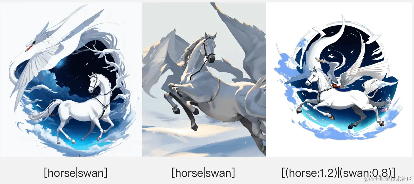 比如: a white[horseswan],也可以结合之前的比重进行设置,比如a white[(horse:1.2)(swan:0.8)]
