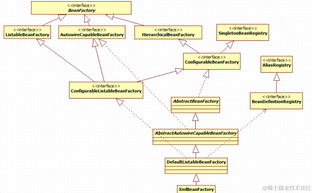 (4)ConfigurableListableBeanFactory是一个更强大的接口,继承了上述的所有接口,无所不包,称为四级接口。(这4级接口是BeanFactory的基本接口体系。