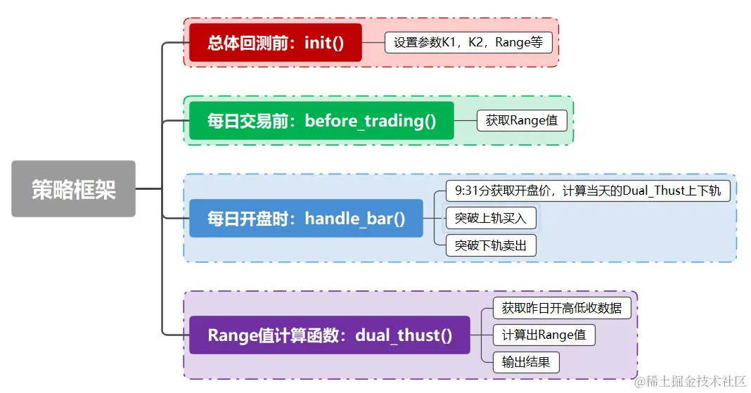 注意本策略需分钟运行,考虑到分钟运行时运行速度较为关键,因此一些必要的数据:例如策略中的Range值,应该是盘前计算完毕,盘中直接使用,开盘价也只需要开盘第一分钟获取即可。如果盘中每分钟运行需要消耗较多的时间,则该策略实际运行时会错失下单价位。