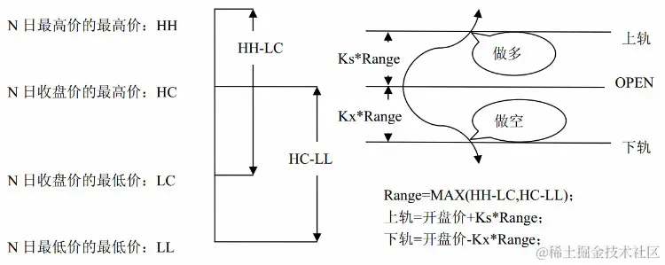 1.计算Dual Thrust的 Range值时,N取1,即通过昨天的开高低收数据来计算出Range值。