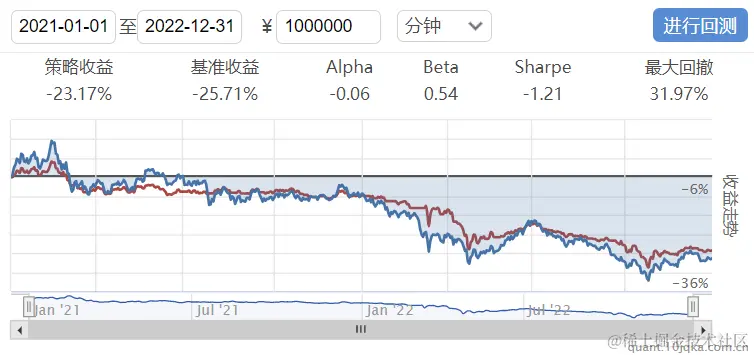 回测结果:红色曲线为策略收益率曲线,蓝色曲线为对应的基准指数收益率曲线