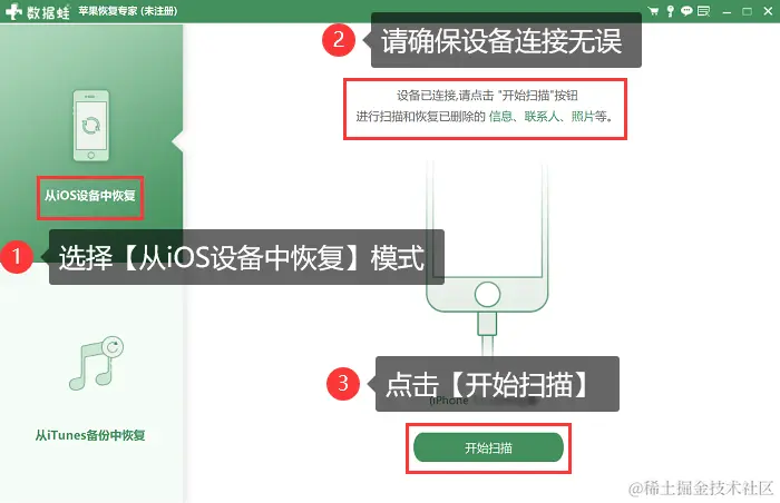 步骤2:软件安装完成后,拿出数据线连接您的手机和电脑。然后选择【从iOS设备中恢复】模式,最后点击【开始扫描】选项等待软件对您的设备进行深度扫描。