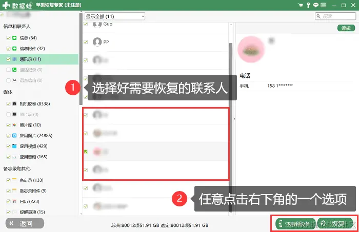 步骤3:数据扫描结束后,点击左侧目录中的【通讯录】文件夹,可以看到手机上的所有联系人都会显示在这里。勾选好想要恢复的联系人,然后点击【还原到设备】或者【恢复】按钮即可。