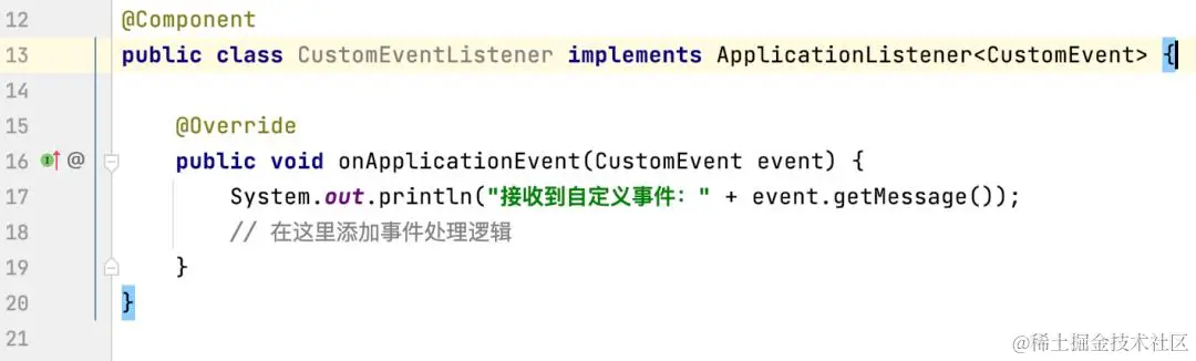 在上面的示例中,我们创建了一个实现了ApplicationListener接口的CustomEventListener类,并使用@Component注解将其注册为Spring组件。这个监听器会在接收到CustomEvent事件时执行onApplicationEvent方法中的逻辑。