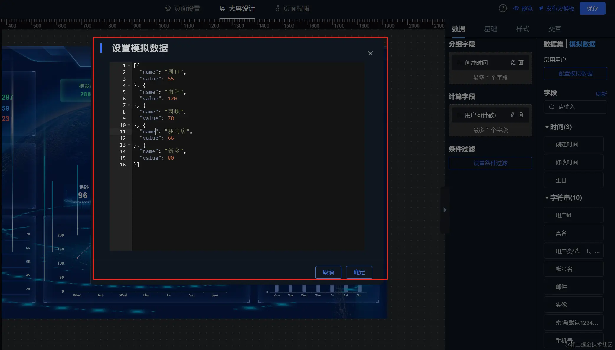 大屏静态数据是指在数据大屏上展示的静态数据,这些数据可以是由系统自动生成的模拟数据,而非真实的业务数据。这些数据可以用于测试和演示,以便在真正的业务数据到来之前进行验证和调试。