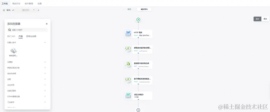 - 小明配置完工作流后,可在右侧配置连接器参数,最后在线调试(为方便演示,只显示核心连接器,配置参数略)