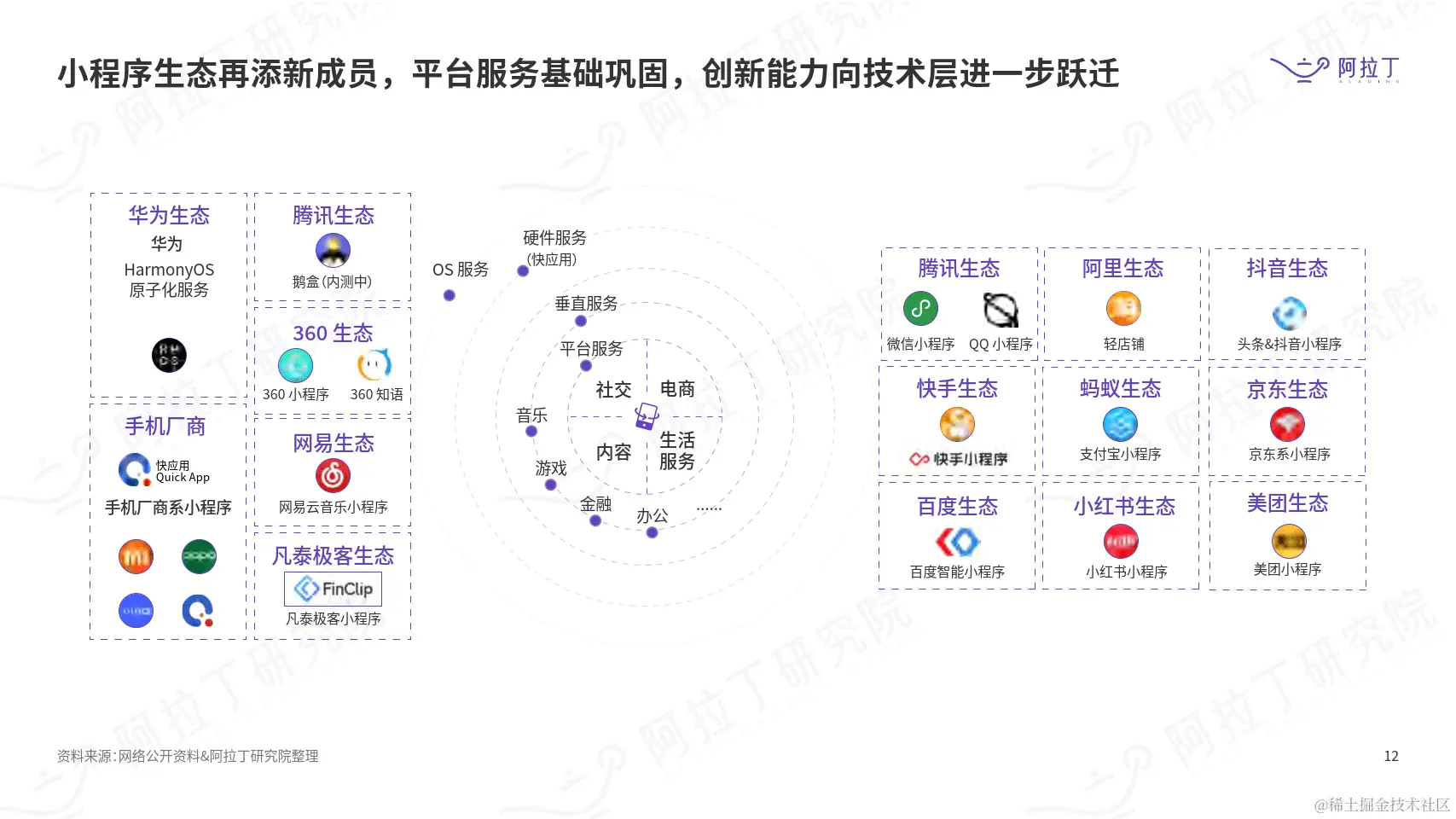 因此,如果将小程序运行时集成到App中,一些碎片化的功能就可以用小程序来实现,从而减少App研发人力的投入,降低研发成本。而且,如果企业自身有不错的能力和想法,还可以整合身边的资源,构建一个像微信一样的小程序生态,打造自己的流量平台。相较于方案一,方案二其实在数字化上走的更彻底,因为它不受平台方的限制,可发展的空间更加宽广。所以,继BAT开启了小程序的上半场后,其他互联网巨头如字节跳动、美团、360等也纷纷开始布局自己的小程序生态,而不是单纯的寄生于微信。
