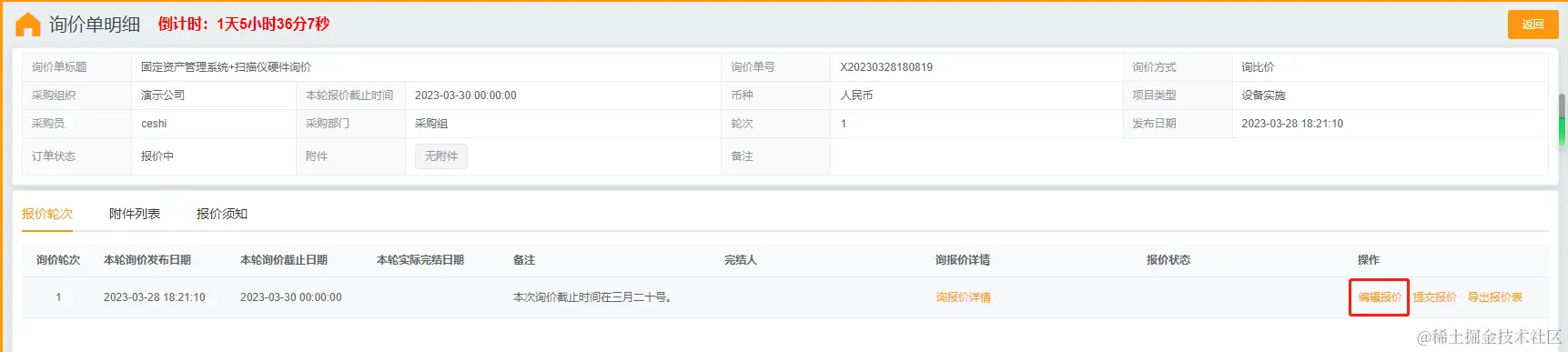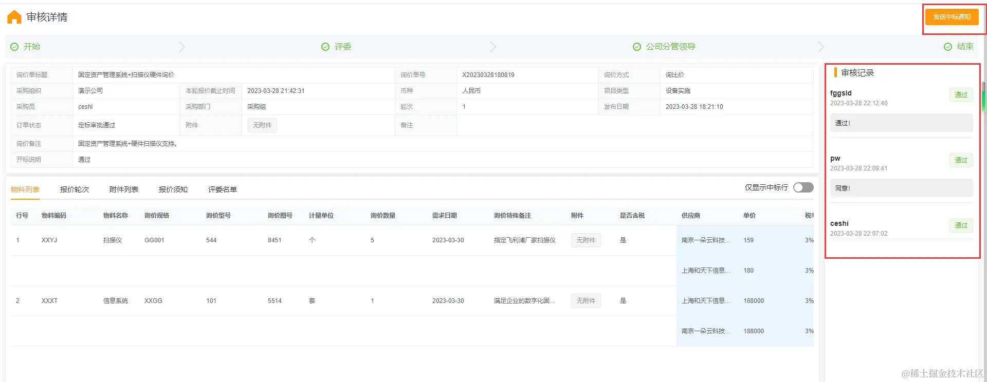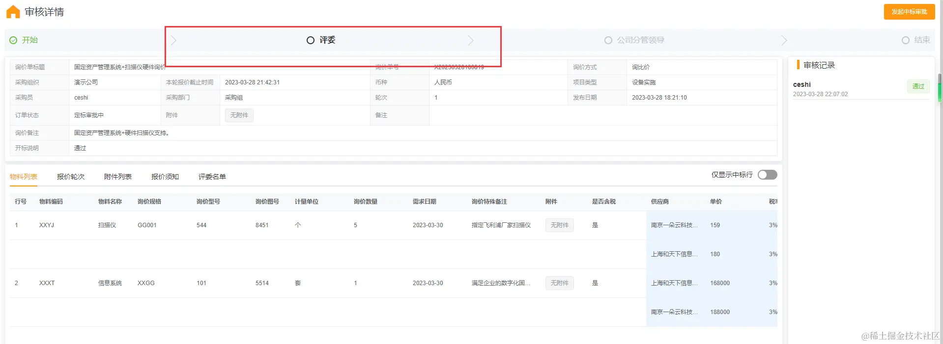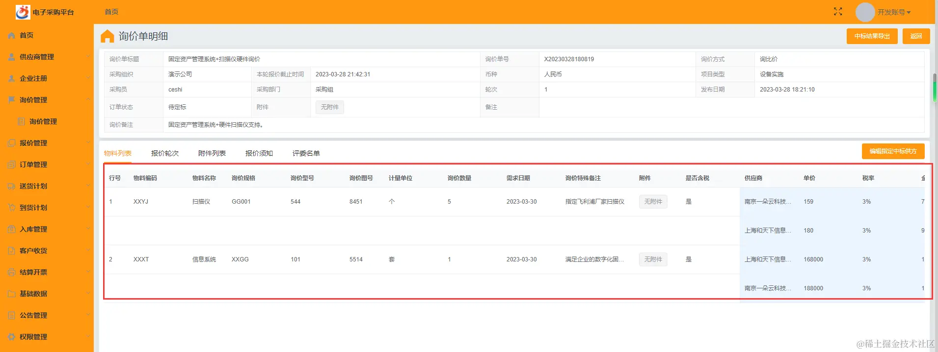 ☆ 整单结束询价后,可以看到竞标供应商的报价: