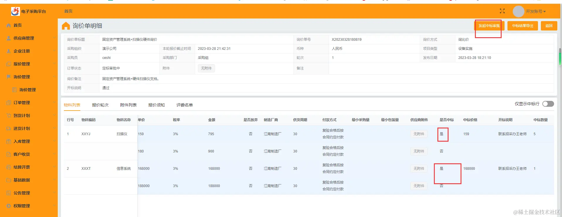 ☆ 确定中标厂商之后,发起中标审批
