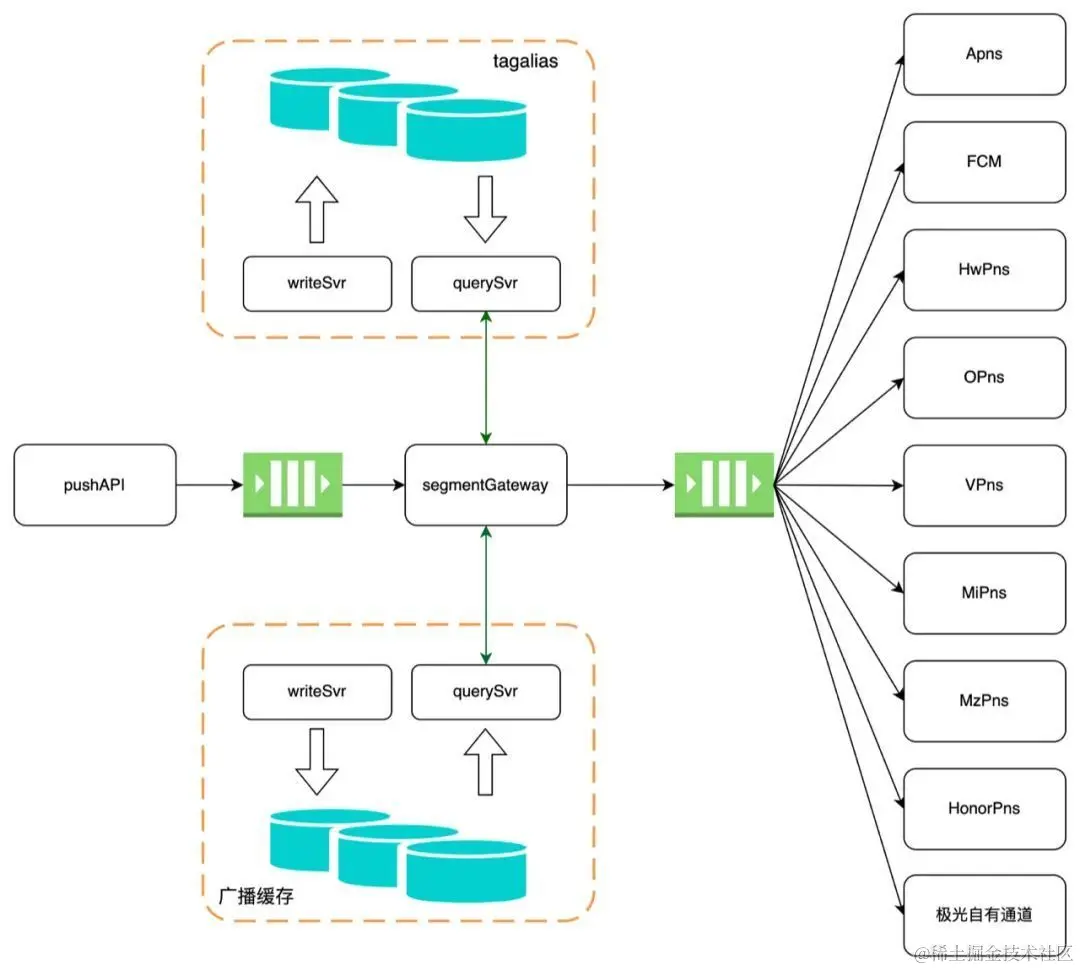 异常处理:当有突增流量时,请求流量压力过大,超过了某个处理环节的所有服务节点的处理能力;或者某个推送通道因为网络抖动、网络中断等处理慢。这些服务节点作为消息中间件的消费者,因为处理能力不足或者处理变慢,未来得及处理的请求堆积在消息中间件,等待扩容或者采取其他处理措施。缓存请求到消息中间件中,从某种程度上也是背压(Back Pressure)模式的一种处理方式,当然还可以进一步的向上游反馈负载压力信息,由上游采取处理措施。例如大量消息需要推送到苹果的推送服务,由于网络波动或者苹果服务器限流,可能出现推送变慢,这个时候推送iOS消息可能会堆积在消息中间件中;其他推送通道并不受此影响,依然能够正常地快速推送消息给其他通道。