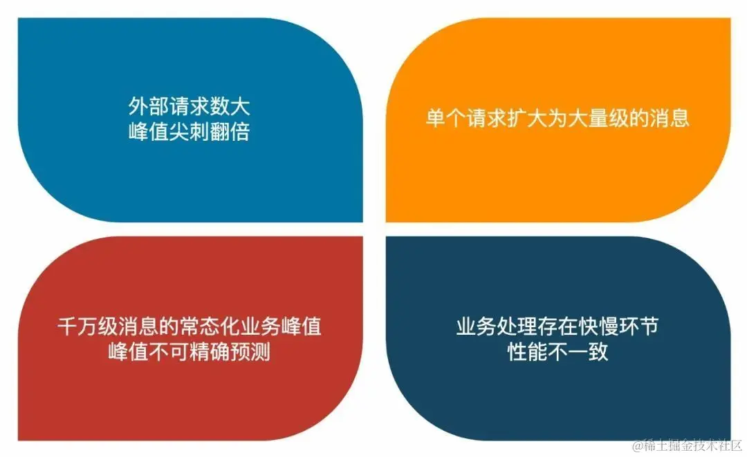 整个系统中同时处理的消息体量非常大,常态化的业务峰值超过千万级别,并且一天时间有多个峰值,不可精确预测。