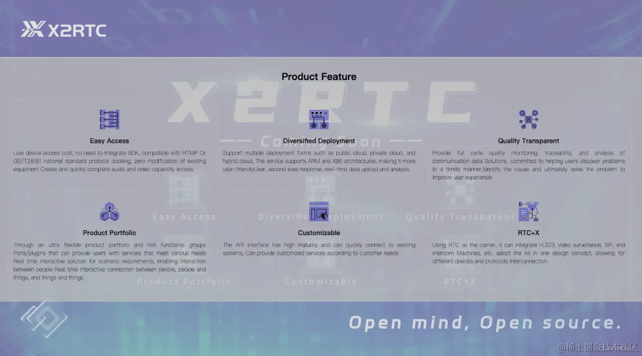 此外,X2Rtc还拥有着接入简单、多样部署、全链路质量透明、灵活产品组合、可定制、RTC+X等六大特质。