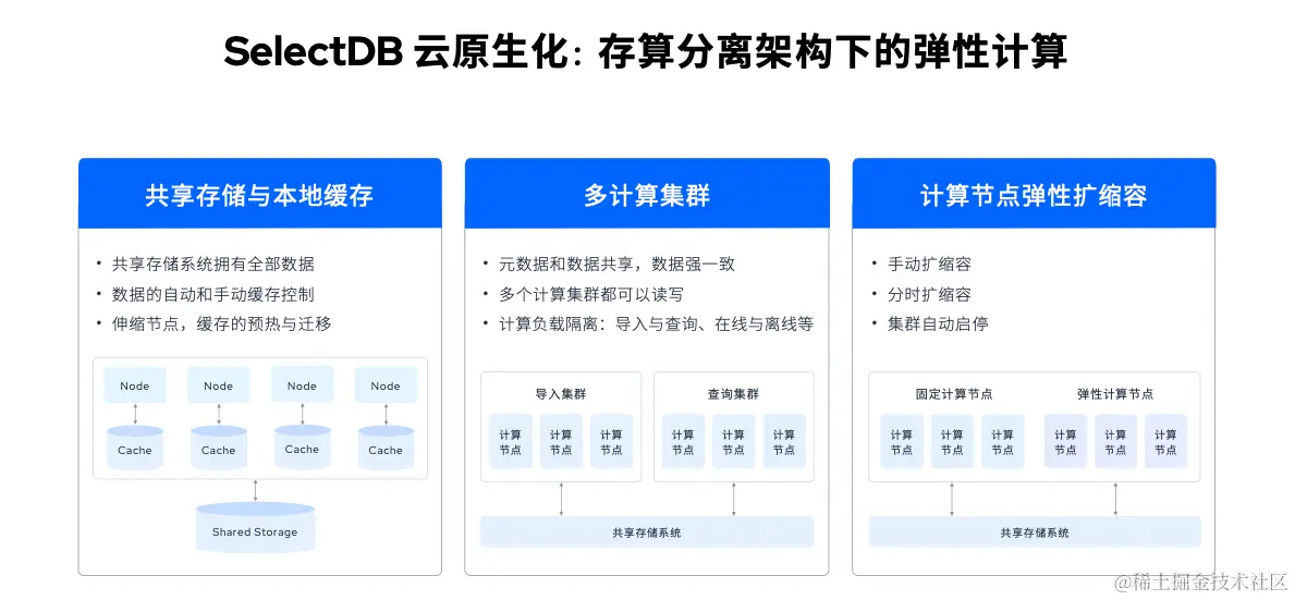 让我们来看看 SelectDB 如何提供云原生能力,简而言之,就是如何更好地基于云做好存算分离架构下的弹性计算。
