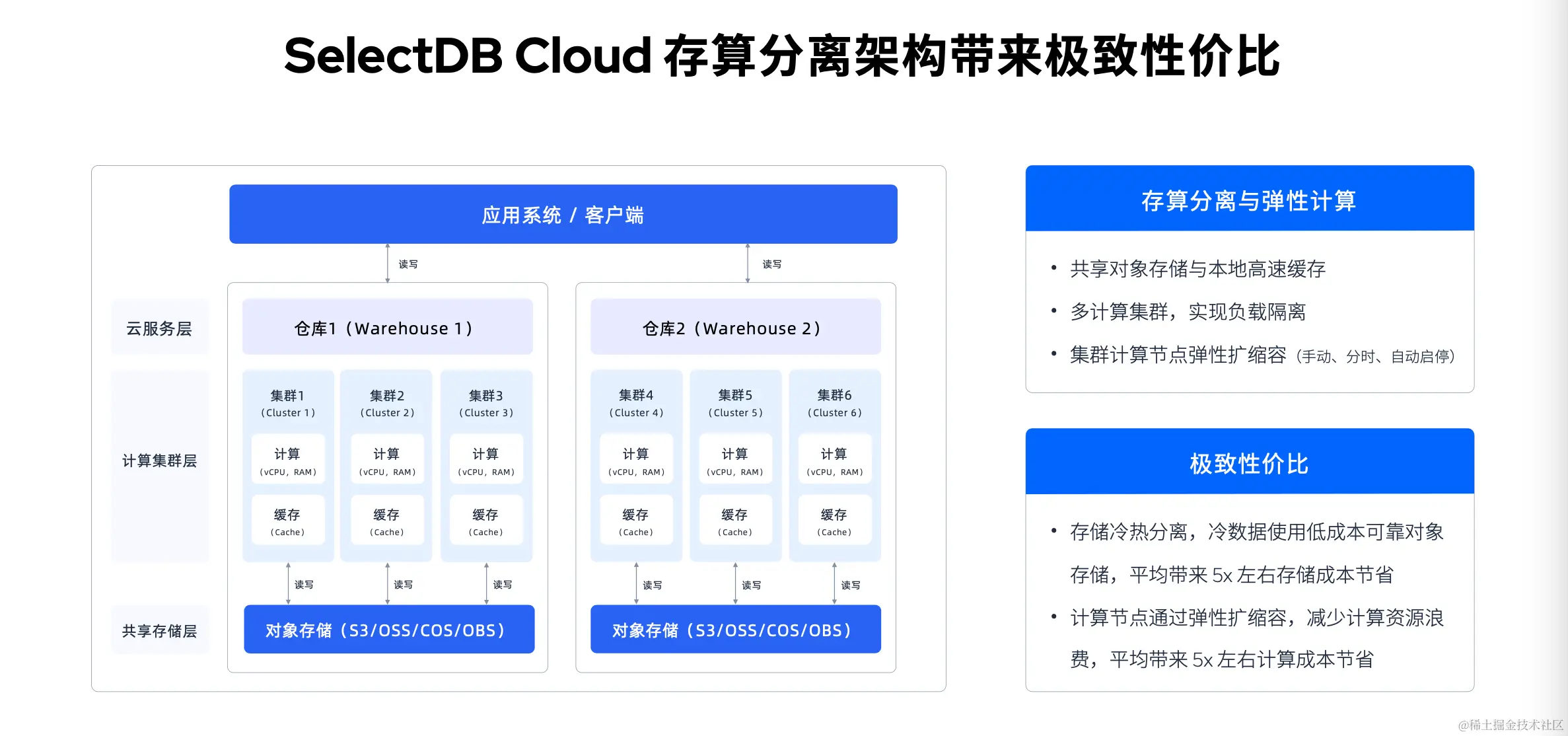 刚才我们介绍了 SelectDB 在存算分离方面的能力,包括共享存储、本地高速缓存、多计算集群以及计算节点的弹性扩缩容等,大家也可以通过以上图来了解 SelectDB Cloud 的整体架构:对于企业而言,可以建立多个仓库、每个仓库可以有多个计算集群,这些集群之间共享对象存储,每个集群由多个计算节点组成,计算节点还可以实现弹性扩缩容。这样的架构也为企业带来了极致性价比: