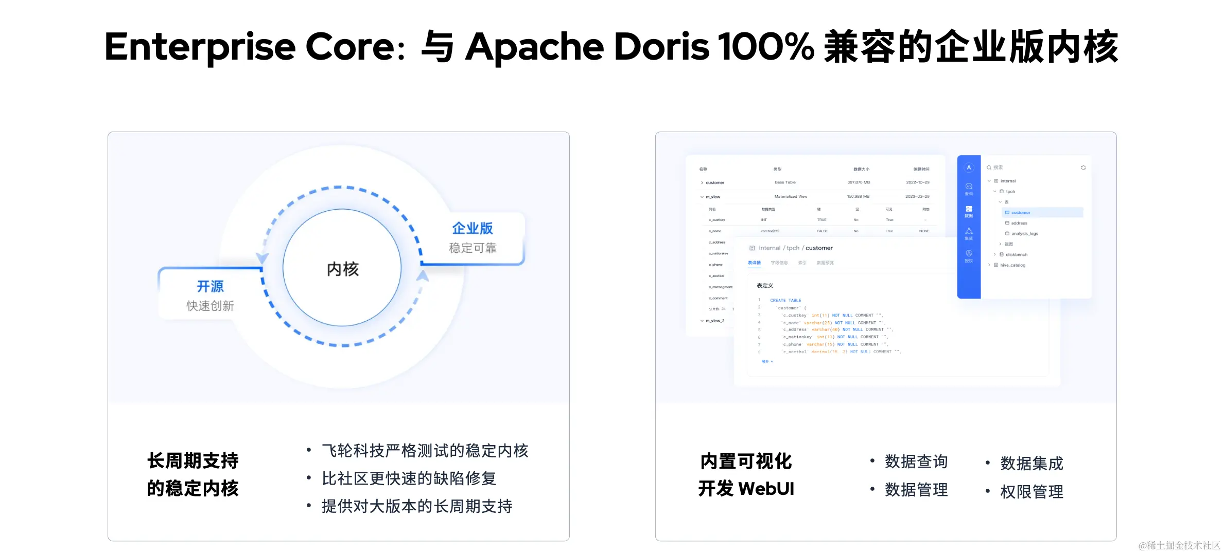 作为一款私有部署和自管理的系统软件,SelectDB Enterprise 内核基于 Apache Doris 构建,并且与 Apache Doris 100% 兼容。