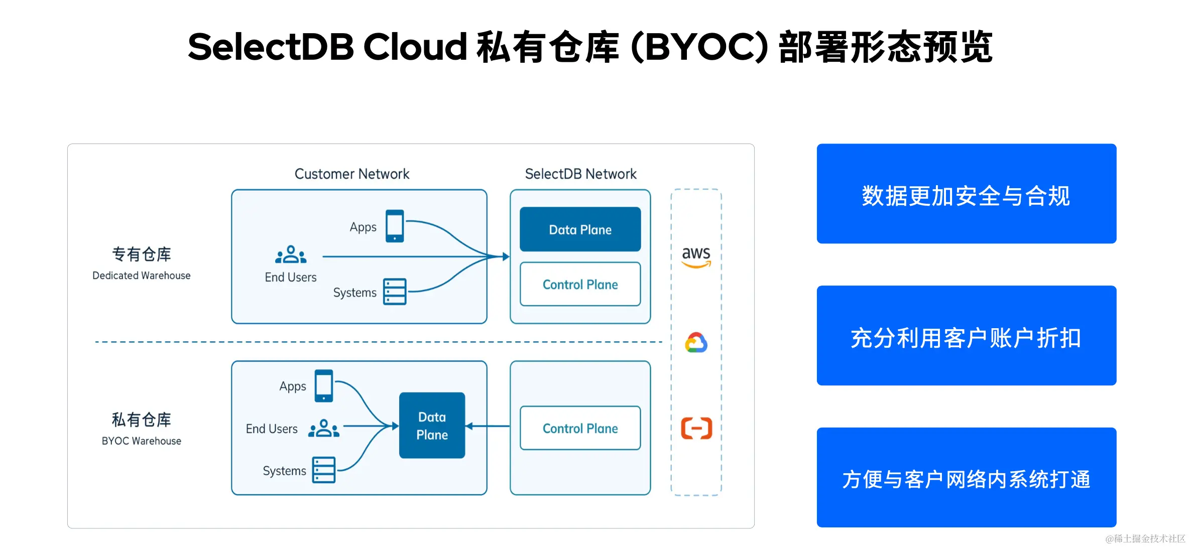 而私有仓库 BYOC 这一解决方案我们仍将控制面放在 SelectDB Cloud 中,可以享受全托管的服务模式、无需自行维护,并且集群将构建在客户的 VPC 中,这样可以保证数据完全存放在客户自有环境中,完全满足安全合规的要求。与此同时,可以充分利用客户在云服务商的账户折扣,成本上更加可控,此外还可以便捷地与客户 VPC 中的上下游系统进行打通。