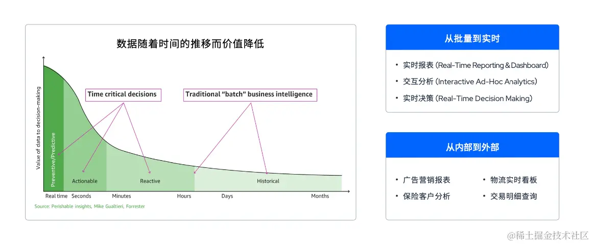 过去,大多数企业使用的传统数据仓库/大数据平台主要是对历史数据进行批量分析,如果能对数据进行实时分析并将分析结果实时运用到业务之中,毫无疑问将会进一步利用好数据的实时价值并驱动业务进步。因此到如今时代,数据分析逐渐从原来的批量处理演变到现在的实时处理。