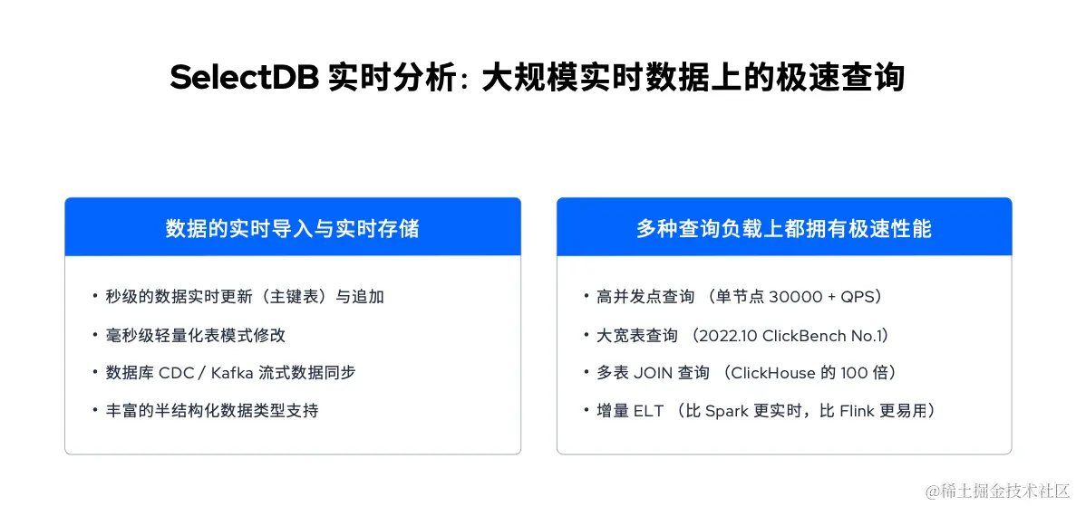 那么 SelectDB 是如何解决实时分析的难点呢?一方面是 SelectDB 实现了 大规模数据的实时导入与实时存储: