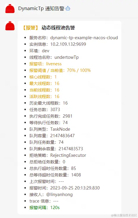 通知告警:提供多种报警维度(配置变更通知、活性报警、容量阈值报警、拒绝触发报警、任务执行或等待超时报警),已支持企业微信、钉钉、飞书、邮件报警,同时提供 SPI 接口可自定义扩展实现