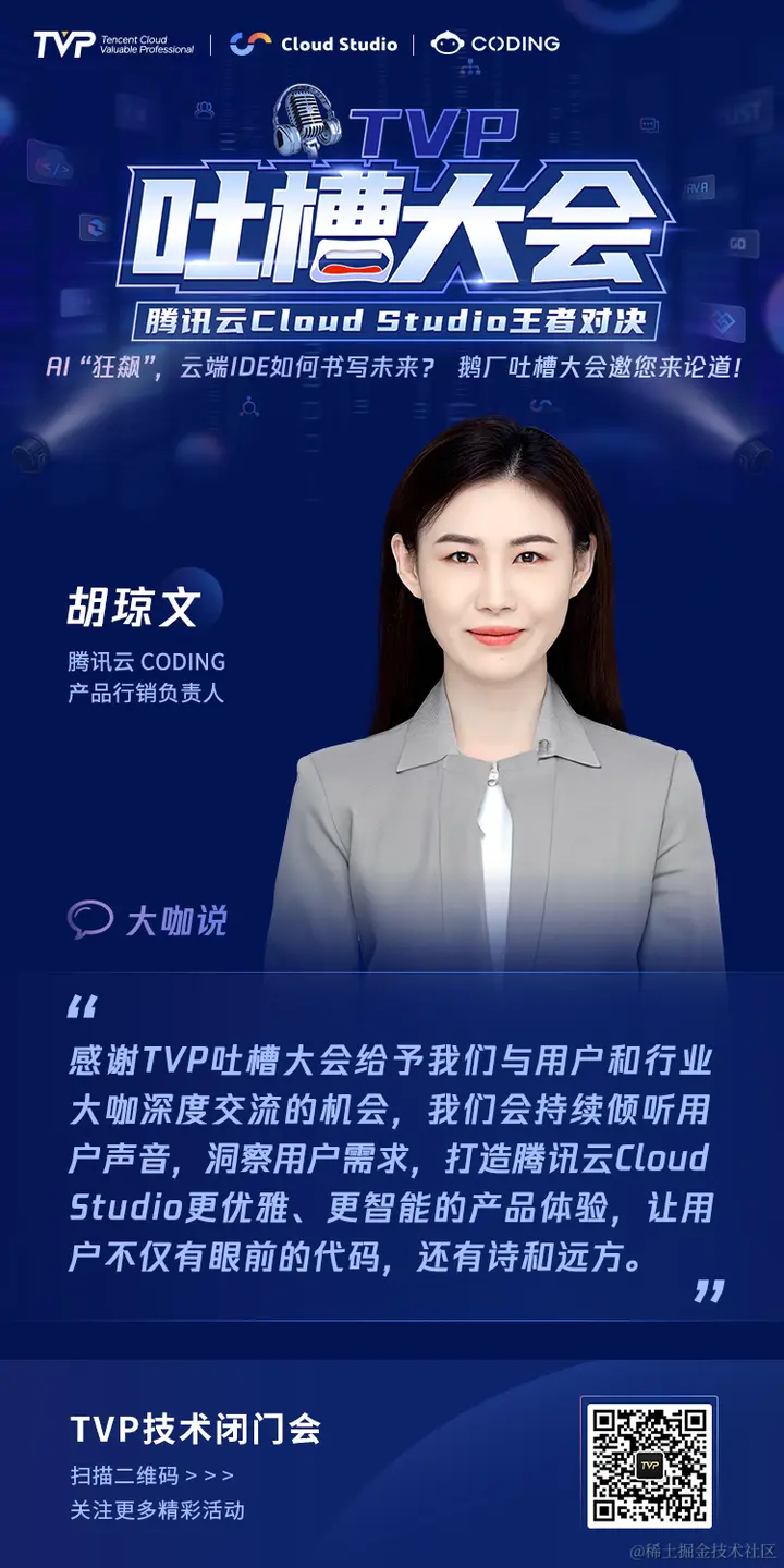 导语 | 近日,由腾讯云 TVP 团队倾力打造的 TVP 吐槽大会第六期「腾讯云 Cloud Studio」专场圆满落幕,6 位资深的 TVP 专家深度体验腾讯云 Cloud Studio 产品,提出了直击痛点的意见与建议,同时也充分肯定了腾讯云 Cloud Studio 的实力与价值,帮助腾讯云 Cloud Studio 从产品能力、用户体验、运营优化等多维度找到进一步提升的方向。技术玩真的,吐槽来狠的,AI 时代的云端 IDE 未来将如何进化?尽在本次精彩碰撞的 TVP 吐槽大会!
