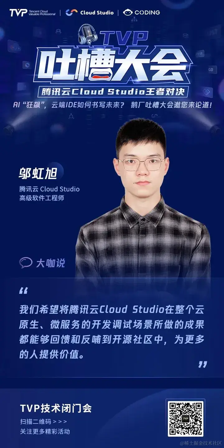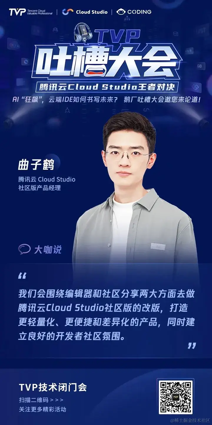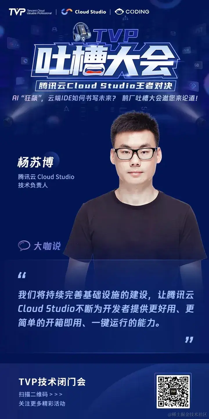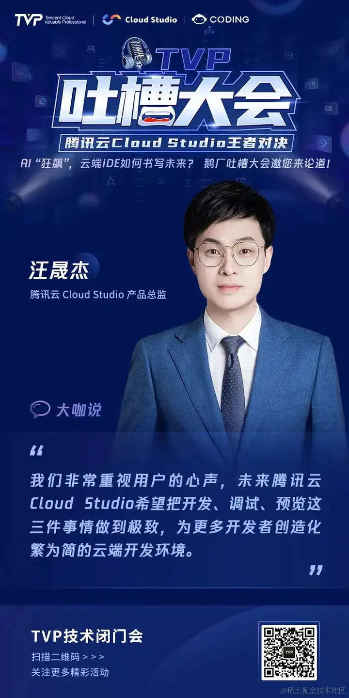 为了倾听用户心声,打造更受用户喜爱的产品,9 月 2 日,腾讯云 Cloud Studio 登上 TVP 吐槽大会的舞台,6 位 TVP 专家与 Cloud Studio 产品及技术掌舵人强强碰撞,直面产品问题,共同为 Cloud Studio 产品指明提升方向,为 AI 时代云端 IDE 的未来发展探索更多可能。