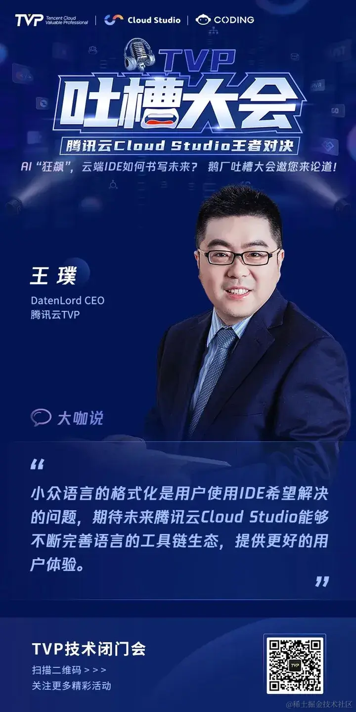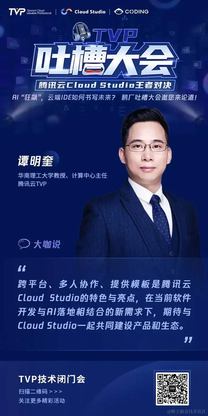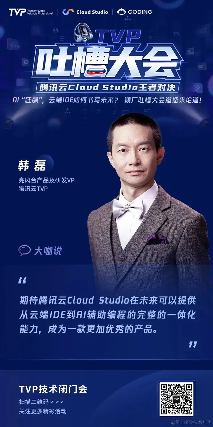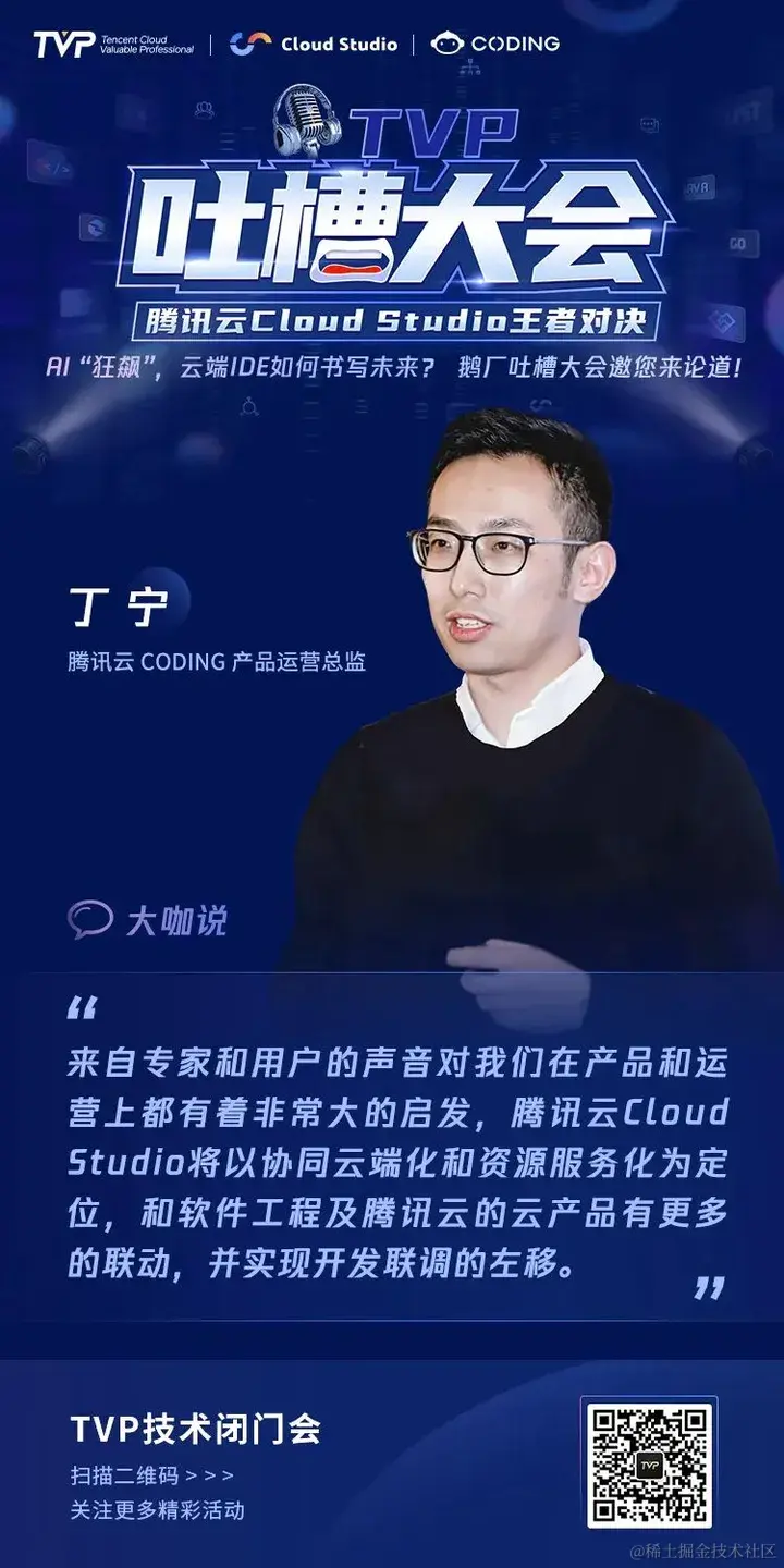 为了倾听用户心声,打造更受用户喜爱的产品,9 月 2 日,腾讯云 Cloud Studio 登上 TVP 吐槽大会的舞台,6 位 TVP 专家与 Cloud Studio 产品及技术掌舵人强强碰撞,直面产品问题,共同为 Cloud Studio 产品指明提升方向,为 AI 时代云端 IDE 的未来发展探索更多可能。