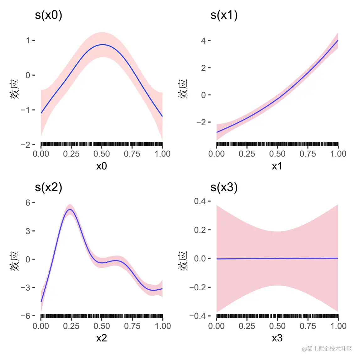 为了将估计的GAMs可视化,mgcv提供了plot.gam()方法和vis.gam()函数,从对象中产生类似ggplot2的图。为了使GAM模型中的四个估计光滑函数可视化,我们将使用