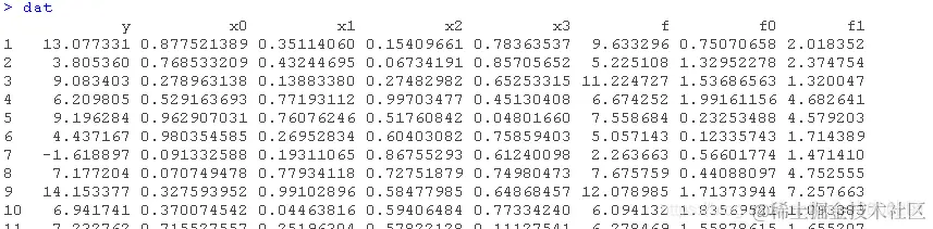 dat中的数据在GAM相关的研究中得到了很好的研究,包含了一些协变量--标记为x0到x3--这些协变量在不同程度上与因变量有非线性关系。